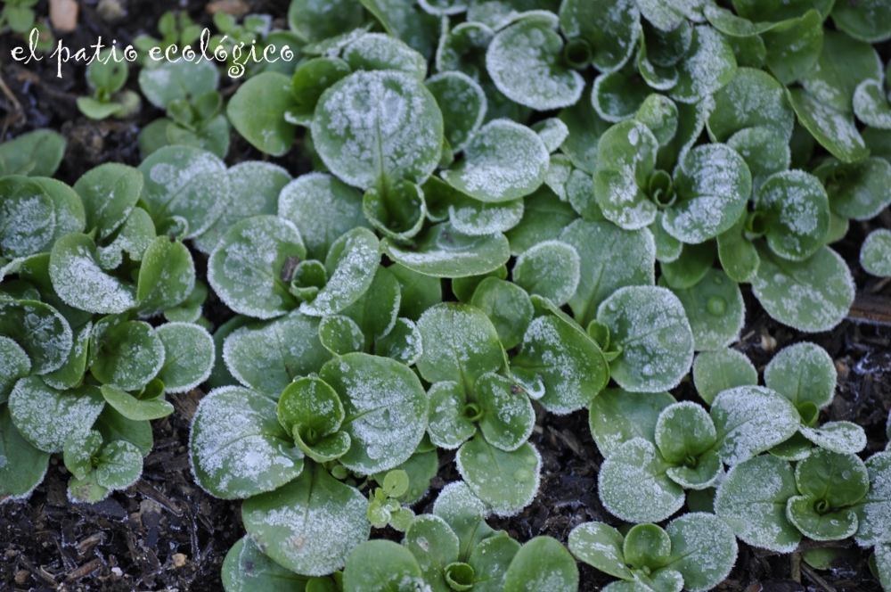 Pero se puede aprovechar estos meses, ya os contamos que nosotros este año tenemos canónigos, que están riquísimos en ensalada y aguantan muy bien el frío. Si no, mirad cómo nos les encontramos al mediodia cuando fuimos a cogerlos hace unos días. Nos encontramos los que están sembrados fuera del invernadero cubiertos con la escarcha de la mañana en cambio dentro del invernadero la escarcha era más líquida, así que ya veis como se nota la protección de los invernaderos.